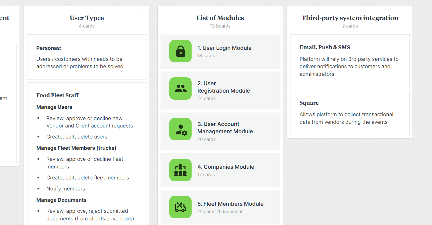 Group functions into modules to ensure reliability and scalability. Document requirements for different actor types to guide the development team effectively.